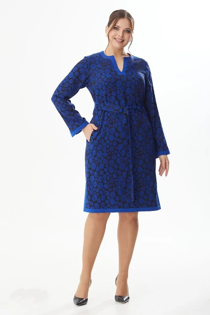 Платье женское деловое офисное классическое прямого силуэта из текстильной ткани. С фигурным вырезом горловины, длиной ниже линии колена. Перед с нагрудными вытачками и прорезными карманами с листочкой. Спинка со средним швом и отрезной кокеткой. В боковых швах обработаны разрезы. Горловина, низ изделия и низ рукавов с отрезными отделочными деталями из однородной ткани. Рукав длинный, втачной, двухщовный, с декоративным разрезом в локтевом шве. Платье комплектуется съемным поясом в цвет изделия. Размеры 48-52: длина платья 104 см, длина рукава 60 см. Размеры 54-58: длина платья 107 см, длина рукава 61 см.