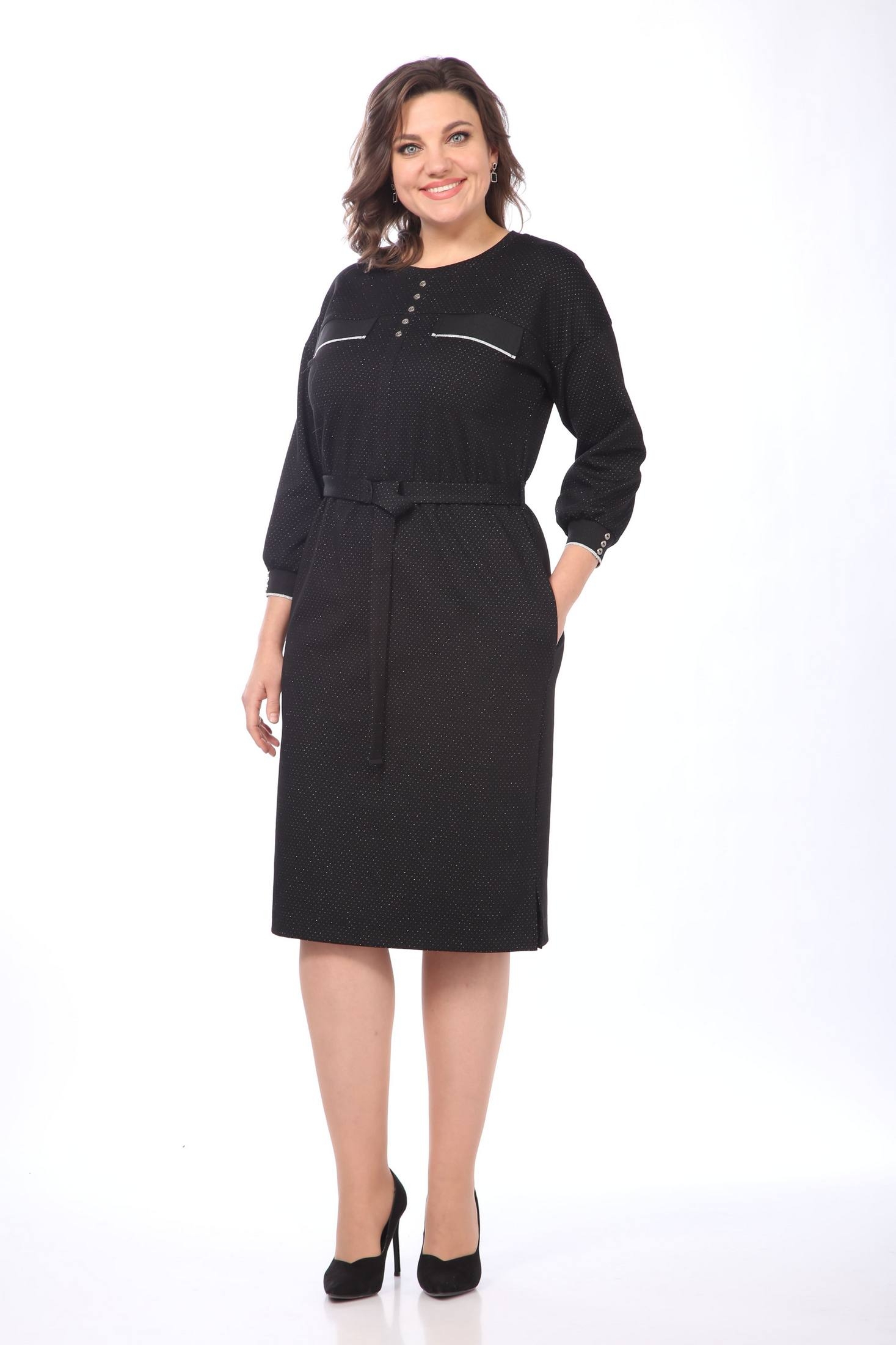 Платье женское, прямого силуэта, из трикотажного полотна с добавлением люрекса. С круглым вырезом горловины, обработанным довязом. Со спущенной линией плеча. Платье отрезное по линии талии, собранное на тонкую эластичную тесьму. Деталь переда с планкой посереди, с пришитыми на ней пуговицами, а также горизонтальной кокеткой с клапанами. В боковых швах обработаны карманы, разрезы понизу. Рукава одношовные, низ которых с трикотажными довязами. По шву довяза пришиты пуговицы. Платье комплектуется съемным поясом с полукольцами.