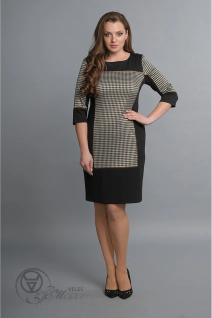 Платье полуприлегающего силуэта с круглым вырезом горловины. Перед с отрезной кокеткой и вставкой по центру детали от пройм. На вставке нагрудные вытачки. Рукав втачной, одношовный, со вставкой по центру рукава. В срезах вставок переда, кокетки и рукава вставлены канты. Спинка с талиевыми вытачками и средним швом. В шве металлическая застежка "молния" и разрез внизу. Размеры 46-50: Длина изделия 94 см, длина рукава изделия 43 см.