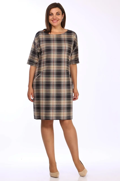 Платье полуприлегающего силуэта с полукруглым вырезом горловины. Перед с прорезными карманами с боковых швов. На карманах нашивки. Рукав спущенный, длиной 3/4. Низ рукава на притачной манжете. В срезах манжеты заложены складки. Спинка с заложенной складкой от горловины до низа. Сверху фиксируется пуговицами, от линии талии - заклепками. Внизу складка переходит в шлицу. Размеры 48-52: Длина изделия 93 см, длина рукава изделия 33 см. Размеры 54-58: Длина изделия 96 см, длина рукава изделия 35 см