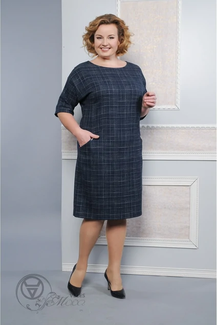 Платье полуприлегающего силуэта с полукруглым вырезом горловины. Перед с прорезными карманами с боковых швов. На карманах нашивки. Рукав спущенный, длиной 3/4. Низ рукава на притачной манжете. В срезах манжеты заложены складки. Спинка с заложенной складкой от горловины до низа. Сверху фиксируется пуговицами, от линии талии - заклепками. Внизу складка переходит в шлицу. Размеры 48-52: Длина изделия 92 см, длина рукава изделия 32 см. Размеры 54-58 : Длина изделия 97 см, длина рукава изделия 33 см.