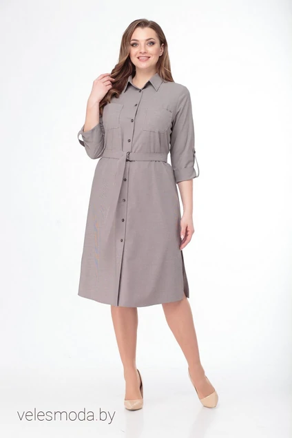 Платье свободного силуэта с фигурным низом с разрезами в боковых швах. По переду изделия нагрудная вытачка и накладные карманы. По спинке кокетка и декоративная вышивка. Воротник стояче- отложной с отрезной стойкой. Застёжка с цельнокроеной планкой на 10 прорезных петель и пуговиц. Рукав втачной одношовный внизу c подворотом с патой, застегивающийся на пуговицу. Платье без подкладки с поясом.