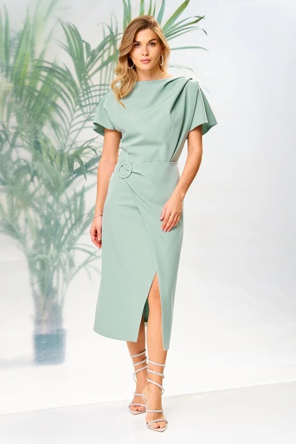 Платье женское из приятной плательной ткани, прилегающего силуэта, длиной до середины икр, со спущенной линией плеча, с застежкой на потайную тесьму-молнию в среднем шве спинки. Деталь переда платья с талиевыми вытачками, с ассиметричной деталью на запах, которая оформлена декоративной пряжкой, на левом плечевом шве обработаны 3 складки. Деталь спинки платья со средним швом, с 2-мя талиевыми вытачками-складками. Вырез горловины платья формы «лодочка», обработан обтачкой.