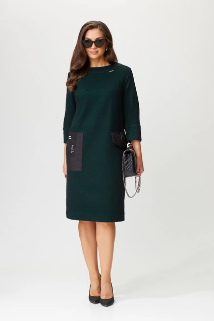 Платье женское, полуприлегающего силуэта, с втачными рукавами, длиной до линии колена, с втачной бейкой по горловине. Деталь переда платья с нагрудными вытачками, с карманами в боковых швах, с левой стороны расположен клапан с «патой» и полукольцом, справа – отделочный элемент с декоративной аппликацией. Рукава втачные одношовные, с притачными манжетами. Манжеты с отделочным элементом. Вырез горловины платья округлой формы, с втачной бейкой, в шов соединения вставлен отделочный кант.