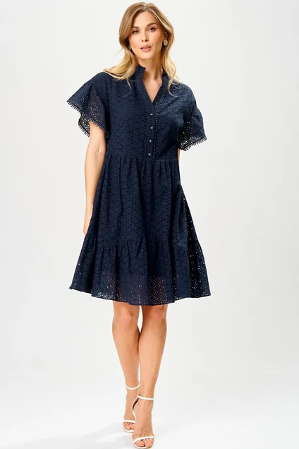 Платье женское из перфорированного хлопка, свободного силуэта, на подкладке,расширенное книзу, длиной ниже коленей,с втачной стойкой по горловине, отрезное на уровне линии талии, со съемным поясом. Лиф деталей переда платья с застежкой на 4 петли и 4 пуговицы, с «V-образным» вырезом, с нагрудными вытачками, исходящие от линии талии, с притачными планками. В шов притачивания планок вставлена декоративная тесьма. Юбка платья конической формы, с горизонтальным подрезом фигурной формы, по швам соединения обработана сборка. Рукава втачные одношовные, короткие, со сборкой по шву втачивания, низ рукавов декорирован отделочной тесьмой. По горловине втачная стойка с «рюшей». Длина рукава – 12см, ширина рукава – 33см, длина спинки – 98см.