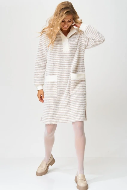 Платье женское, повседневное, свободного силуэта, с втачными рукавами, длиной ниже коленей, с втачной стойкой по горловине, со съемным поясом. Деталь переда платья с нагрудными вытачками, с втачной планкой, с 2-мя накладными карманами. Рукава втачные одношовные, с притачными манжетами. Вырез горловины платья «под горло», с втачной стойкой, в боковых швах обработаны разрезы.