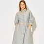 Платье женское, полуприлегающего силуэта, с втачными рукавами, длиной до коленей. Деталь переда платья с нагрудными вытачками, вверху расположен съемный декоративный «цветок». На детали спинки вверху настрочена декоративная тесьма. Рукава втачные одношовные, короткие. Вырез горловины платья округлой формы, обработан обтачкой. По низу платья съемный элемент из отделочной ткани, который застегивается на 13 петель и 13 пуговиц. Длина спинки – 92см. Длина рукава - 19см, ширина рукава – 18,5см.