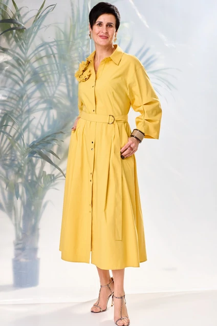 Платье женское из хлопковой плательной ткани, прилегающего силуэта, расширенное к низу, длиной ниже линии коленей, со спущенной линией плеча, с втачными рукавами, с втачным воротником, с втачными планками, отрезное на уровне линии талии, с центральной застежкой на 11 кнопок и 1 кнопку на стойке воротника, со съемным поясом. Лиф деталей переда платья с нагрудными вытачками, исходящими от талии, слева вверху расположен декоративный элемент. Лиф детали спинки с 2-мя вытачками. Юбка платья конической формы, в боковых швах обработаны наклонные карманы, передние полотнища с вытачками-складками. Рукава втачные двухшовные, длиной ¾, на передних швах заложены по две складки. Воротник сорочечный с отрезной стойкой.