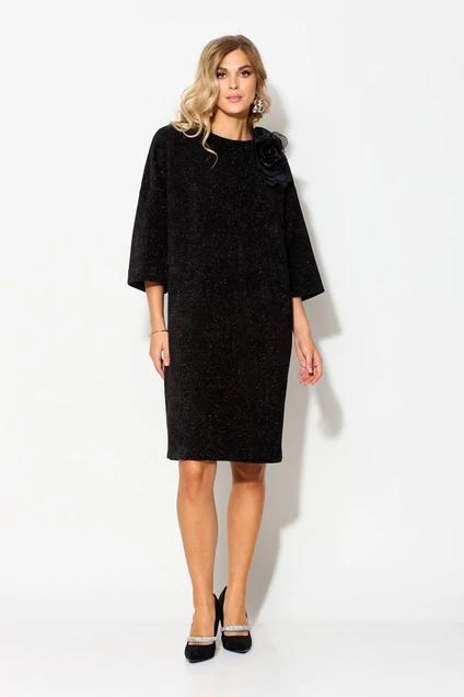 Платье женское, нарядное, прямого силуэта, со спущенной линией плеча, с втачными рукавами, длиной до коленей, со съемным декоративным элементом. Деталь переда платья с нагрудными вытачками. Спинка платья со средним швом, который заканчивается шлицей. Рукава втачные одношовные, длиной ¾. Вырез горловины платья округлой формы, обработан обтачкой.