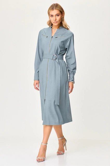 Платье женское, свободного силуэта, расширенное книзу, длиной до середины икр, со спущенной линией плеча, с втачными рукавами, с втачной стойкой, в боковых швах обработаны карманы, с центральной сквозной застежкой на металлическую тесьму-молнию, со съемным поясом с застежкой на металлическую пряжку-«полукольцо». Деталь переда платья с нагрудными вытачками, вверху обработаны по 2 рамки с металлическими молниями. Деталь спинки платья с кокеткой, по шву соединения по центру настрочена аппликация-вышивка, и обработаны 2 складки. Рукава втачные двухшовные, с притачными манжетами, застегивающимися на 1 кнопку. По швам притачивания манжет закладываются по одной односторонней складке. Вырез горловины с втачной стойкой, обработан обтачкой. Декор может отличаться от представленного на фотографии.