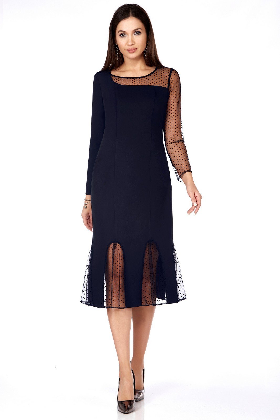 Нарядное платье годе, длина «миди». Платье элегантное, соответствующие веяниям моды. Верхняя часть платья построена на асимметрии: делать лифа и левый рукав выполнены из прозрачной ткани «мушками». Впереди рельефы от проймы, в боковом шве застежка «молния». По спинке та же асимметрия и вертикальные рельефы. Внизу по линиям швов – закругленные клинья со складочками (из прозрачной ткани), создающие силуэт годе. Рукав длинный. Силуэт платья подчеркивает фиругу.