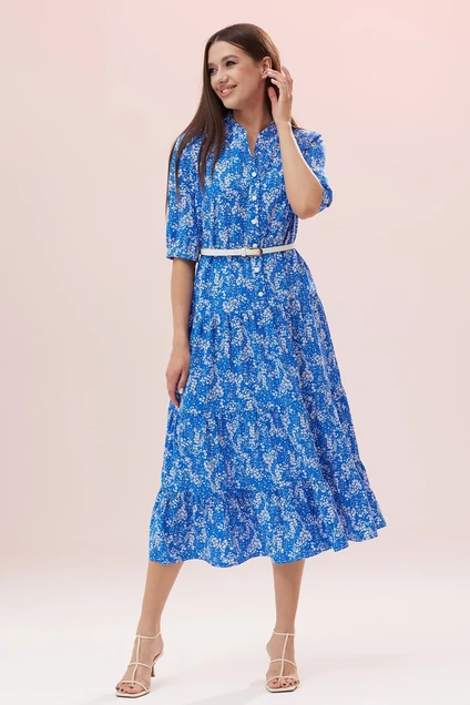 Легкое, воздушное, летнее платье состоит из отрезного удлиненного лифа и юбки, состоящей из трех горизонтальных воланов со сборкой. Спереди лиф платья имеет нагрудные горизонтальные вытачки и вертикальную функциональную планку-застежку на петли-пуговицы. Горловина обработана воротником-стойкой. Рукав втачной, одношовный. Низ рукава с лаконичной сборкой, на манжете с застежкой. Длина рукава 34 см. Длина платья по спинке 121 см. Платье дополнено ремнем, который по желанию подчеркнет изящество фигуры.