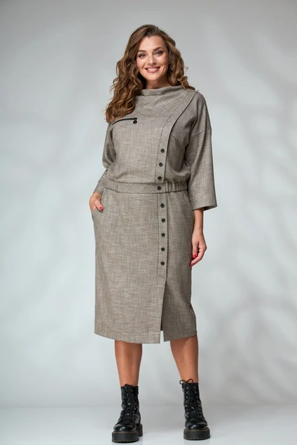 Платье женское, прямого силуэта на подкладке двухслойное. По низу верхней части полочки и спинки притачной пояс, по бокам с резинкой. С левой стороны полочки притачная планка с пуговицами. По правой стороне полочки - подрез с декоративной молнией. Вырез горловины- стойка с мягкой качелью. Нижняя часть платья заужена к низу, с левой стороны цельнокроеная планка, в нижней части - шлица. По планке - пуговицы. Рукав рубашечного кроя