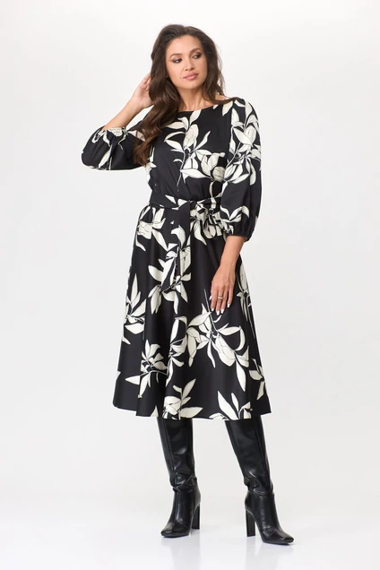 Платье женское полуприлегающего силуэта по талии на резинке. Горловина округлая. Рукав втачной со сборкой на резинке по низу. По спинке декоративный разрез в области горловины. Изделие без застежки. В комплекте пояс из основной ткани.