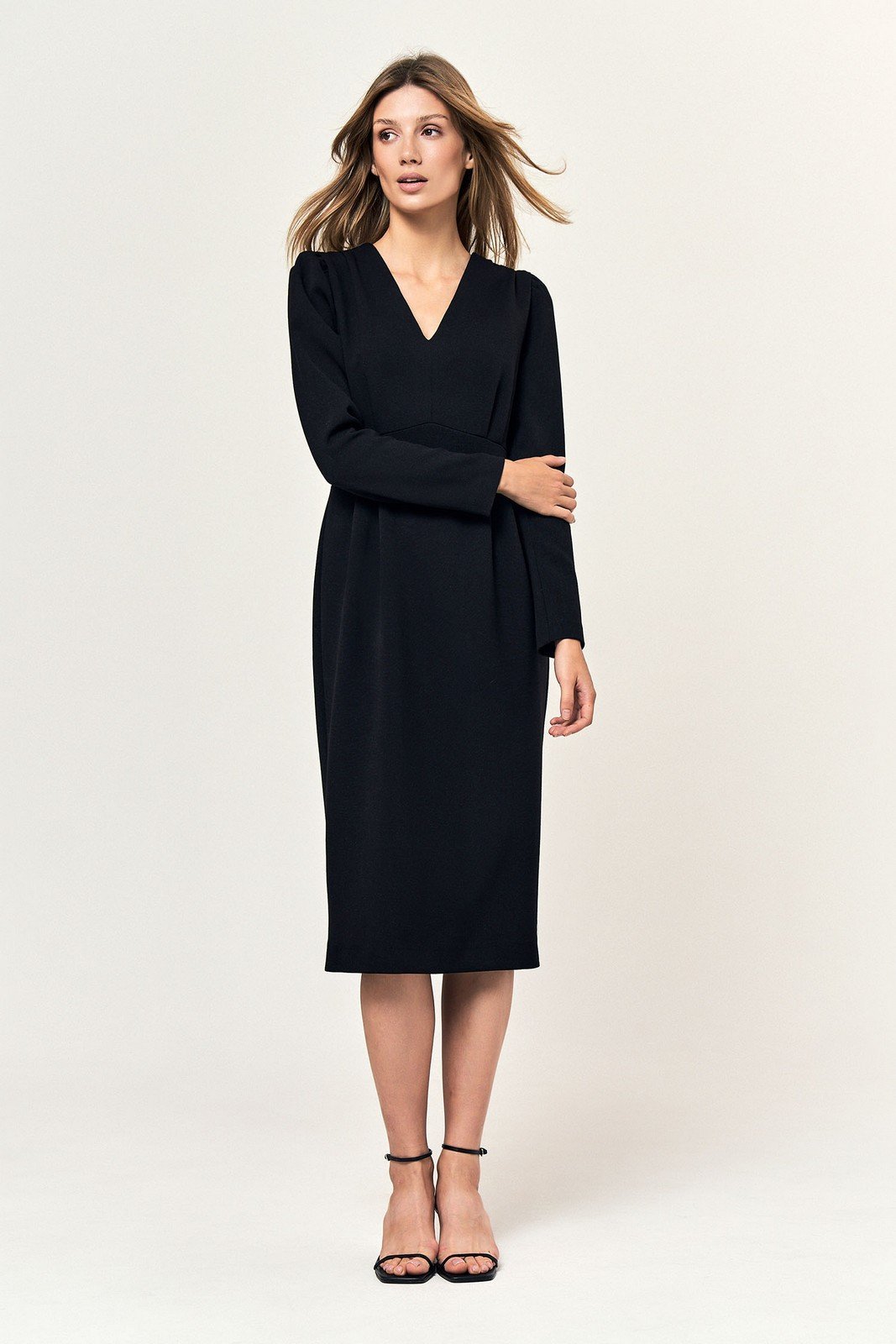 Платье женское приталенное длиной ниже линии колена на нежной эластичной подкладке. Вырез V-образный. Отрезное по линии талии. По переду ниже линии груди подрез с возвышение по центру, от горловины до подреза средний шов, на уровне вытачек от подреза вверх и вниз заложены по две односторонние складки. По плечевому срезу переда -сборка. Спинка со средним швом, с талиевыми вытачками выше линии подреза и двумя складками ниже линии подреза. В среднем шве спинки застежка на потайную тесьму-молнию и разрез. Рукав одношевный, втачной со сборкой по окату. Это платье будем чудесным решением для торжественного мероприятия или будет радовать Вас своим удобством в повседневной носке.