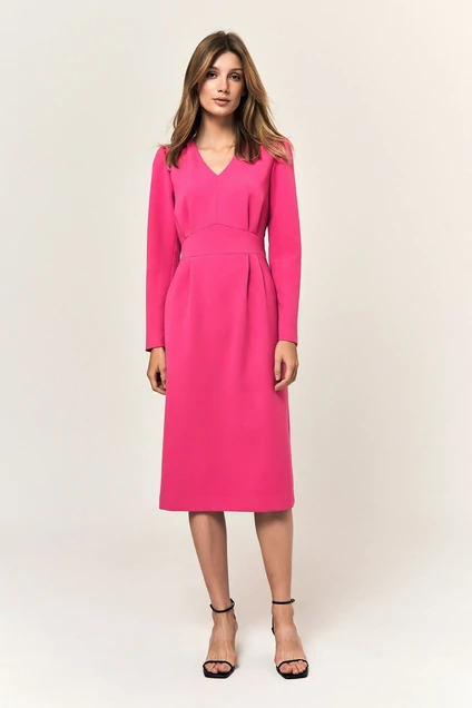 Платье женское приталенное длиной ниже линии колена на нежной эластичной подкладке. Вырез V-образный. Отрезное по линии талии. По переду ниже линии груди подрез с возвышение по центру, от горловины до подреза средний шов, на уровне вытачек от подреза вверх и вниз заложены по две односторонние складки. По плечевому срезу переда -сборка. Спинка со средним швом, с талиевыми вытачками выше линии подреза и двумя складками ниже линии подреза. В среднем шве спинки застежка на потайную тесьму-молнию и разрез. Рукав одношевный, втачной со сборкой по окату. Это платье будем чудесным решением для торжественного мероприятия или будет радовать Вас своим удобством в повседневной носке.