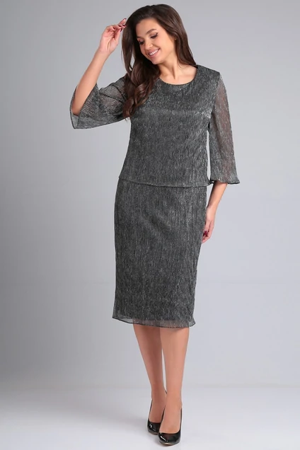 Платье на трикотажной подкладке, двухъярусное с отлетным лифом. Вырез горловины круглый. Без застежки. Рукав втачной одношовный расширенный к низу длиной ниже локтя. Платье полуприлегающего силуэта, длиной ниже колена. Блестящая, переливающаяся ткань этого платья просто покорит Вас и Вы неизменно будете притягивать к себе взгляды.