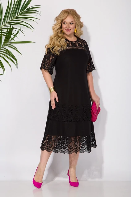 Это нарядное женское платье длиной миди больших размеров позволит разнообразить ваш образ для вечернего выхода. Выполненное из хлопкового кружева и однотонной ткани, придаст вам нарядный вид для торжественных мероприятий и не только. Модель трапециевидного силуэта, что зрительно скрывает все недостатки фигуры, подчеркивая ваши достоинства. Вырез горловины округлый. Кокетка выполнена из кружева. Рукав до локтя, расклешен к низу. Низ платья с декоративными членениями и вставками из хлопкового кружева! Спинка с небольшим разрезом у горловины на потайную пуговку. В платье имеются боковые карманы. Данное модное однотонное изделие для женщин и девушек размера плюс сайз (Plus size) отлично подойдет для на 8 Марта и юбилей!