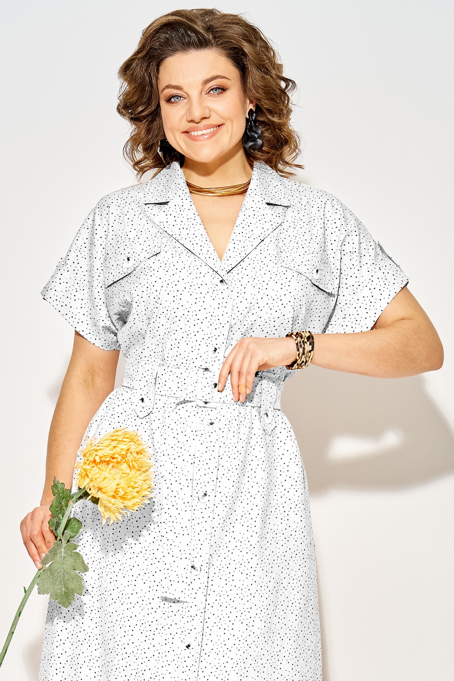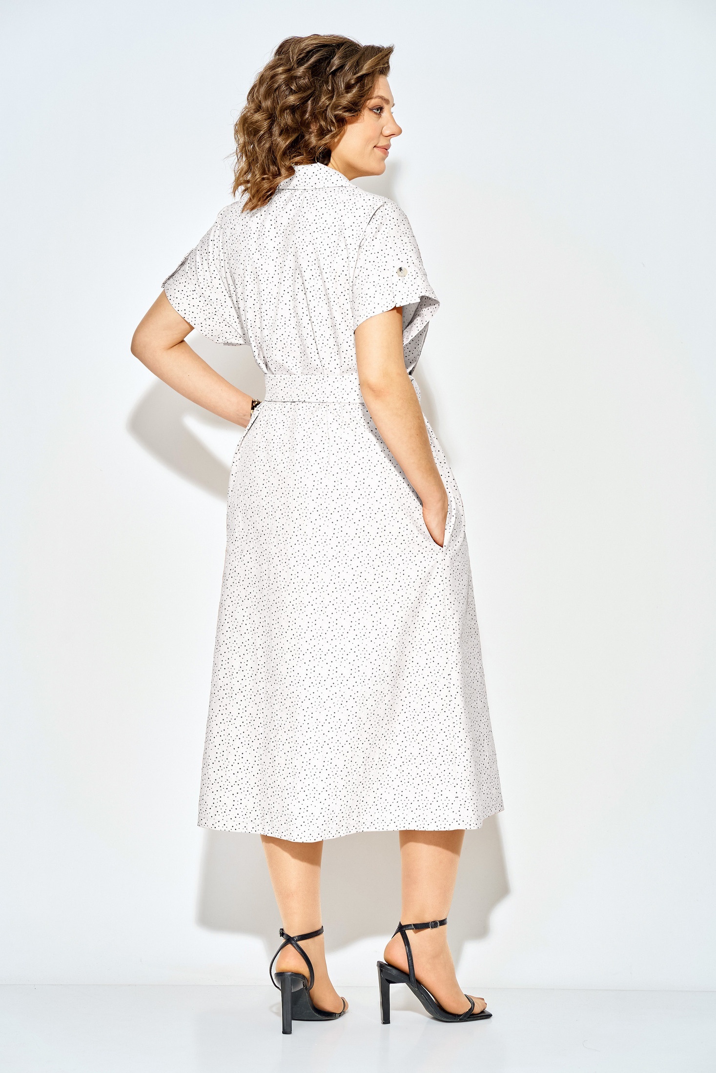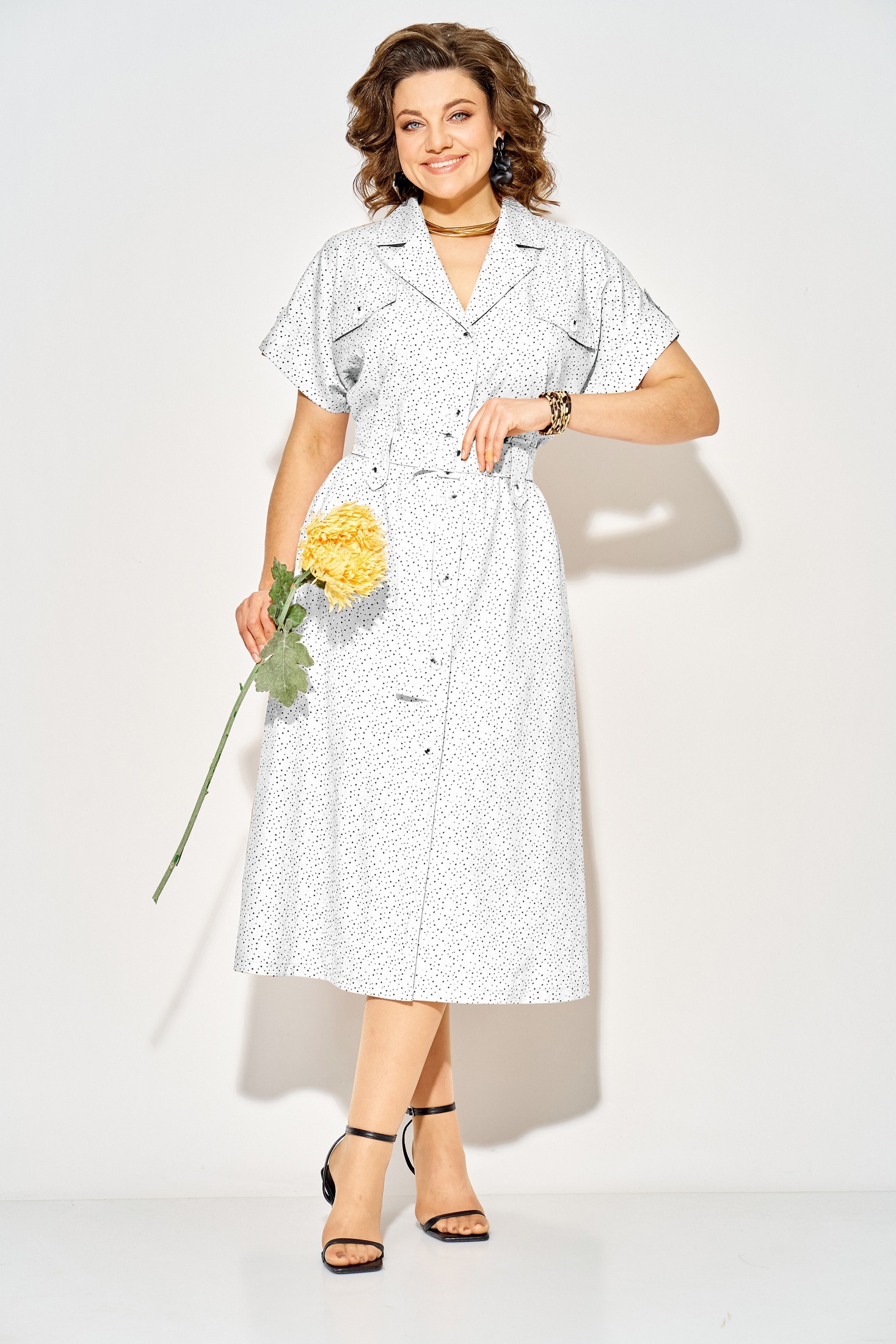 Платье 1521 белый + горох Liliana-style — это идеальный выбор для летних будней. Коллекция бренда Liliana-style представляет модель из хлопка и полиэстера, обеспечивающих комфортную носку и долговечность. Трапециевидный силуэт с отложным английским воротником и спущенной линией плеча делает платье стильным и удобным. Центральная застежка на петли и пуговицы, а также съемный пояс с роговой пряжкой добавляют оригинальности. Платье достигает длины 120 см по спинке и оснащено боковыми карманами, что повышает его функциональность. Декоративные паты на рукавах завершают образ, выводя его в категорию повседневного стиля. Белый цвет с рисунком горох подходит для офисного дресс-кода и праздничных мероприятий. Длина по спинке – 120 см, Рукав – 22 см.