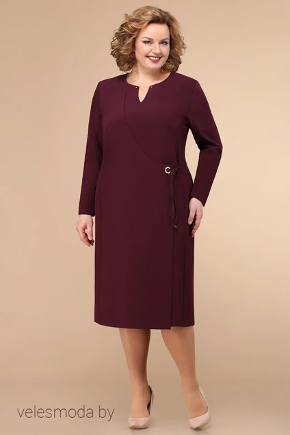 Повседневное текстильное платье прямого силуэта средней длины за колено. Рукав втачной длинный. Вырез горловины фигурный, декорирован двумя золотыми бусинами. Центральная часть платья с запАхом, по переду бочкИ с нагрудными вытачками. Отлетная часть платья фиксируется на завязку, продетую через золотую блочку. По спинке плечевые вытачки и средний шов со шлицей.