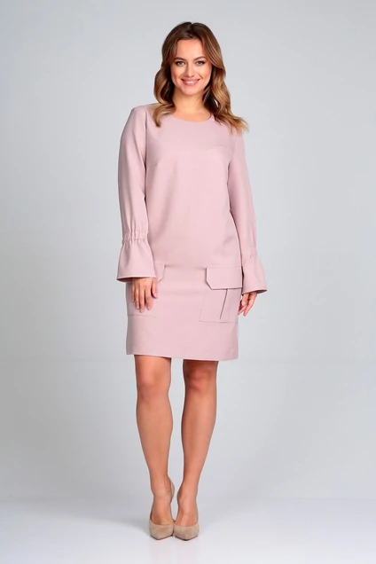 Платье прямого силуэта, слегка приталенное в области талии. Рукав втачной. Снизу часть рукава собрана на эластичную тесьму. По переду платья нагрудные выточки, накладные карманы с настрочными клапанами. По спинке в среднем шве потайная молния.