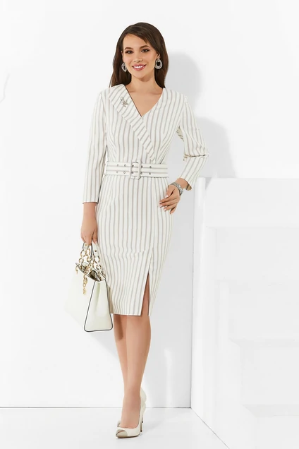 Дизайнерское платье в стиле минимализм с имитацией запаха дополнено брошью и съемным поясом. Платье полуприлегающего силуэта отрезное по линии талии с V-образным вырезом. Лиф оформлен нагрудными вертикальными вытачками от подреза. Юбка асимметричная с высокой шлицей по переду. Застежка на потайную молнию в среднем шве спинки. Спинка со средним швом и талиевыми вытачками . На обтачке спинки плятья выполнена аккуратная вышивка (текстовый логотип бренда). Рукава втачные с отлетной шлицей по низу, шлица с пришитыми пуговицами.