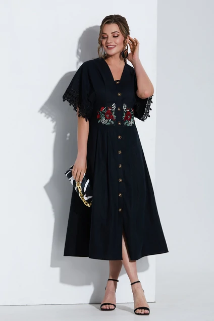 Льняное платье «Boho» миди с вышивкой и кружевом. Платье на основе цельнокроеного покроя с втачным поясом, на лифе и юбке застрочены мягкие складки. Перед с V-образным вырезом и центральной застежкой на петли и пуговицы. Спинка со средним швом и талиевыми вытачками, в боковые швы вставлены завязки пояса. Рукав цельнокроеный с настроченным кружевом. Юбка на х/б подкладке.