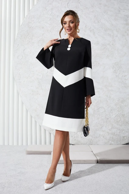Стильное геометрическое платье платье А образного силуэта с декоративными пуговицами зрительно стройнит и вытягивает силуэт. Платье с округлым вырезом с V образной каплей. Лиф платье со средним швом и нагрудными вытачками из проймы, юбка со средним швом и притачной деталью. Спинка со средним швом и застежкой на потайную молнию. Рукав втачной расширен к низу.Стирка-только химчистка.