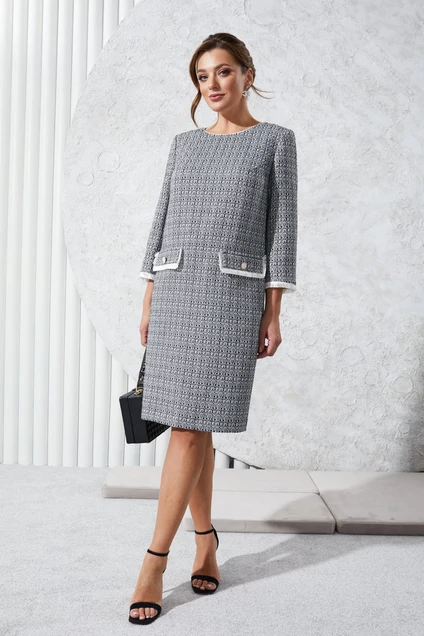 Стильное платье прямого силуэта с накладными клапанами и декоративными пуговицами отлично впишется в ваш гардероб, стильная классика вне времени. Платье прямого силуэта с легким приталиванием и округлым вырезом, вырез обработан контрастным кантом в тон тесьмы по низу рукава и клапанам. Перед оформлен нагрудными вытачками, спинка со средним швом и талиевыми вытачками. Застежка на потайную молнию в среднем шве спинки, по низу шлица. Рукав втачной, низ оформлен декоративной тесьмой с бахромой как на клапанах. Платье на подкладке.