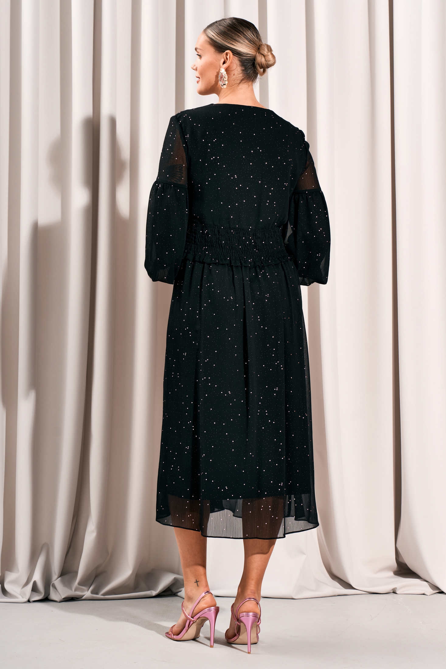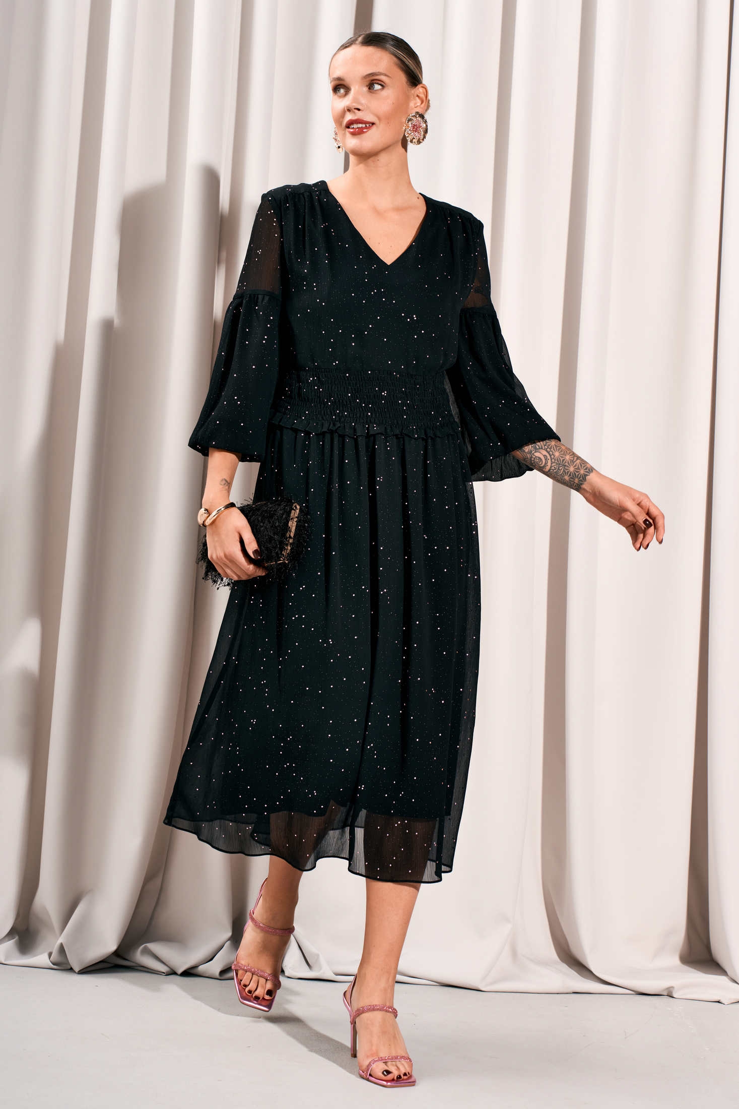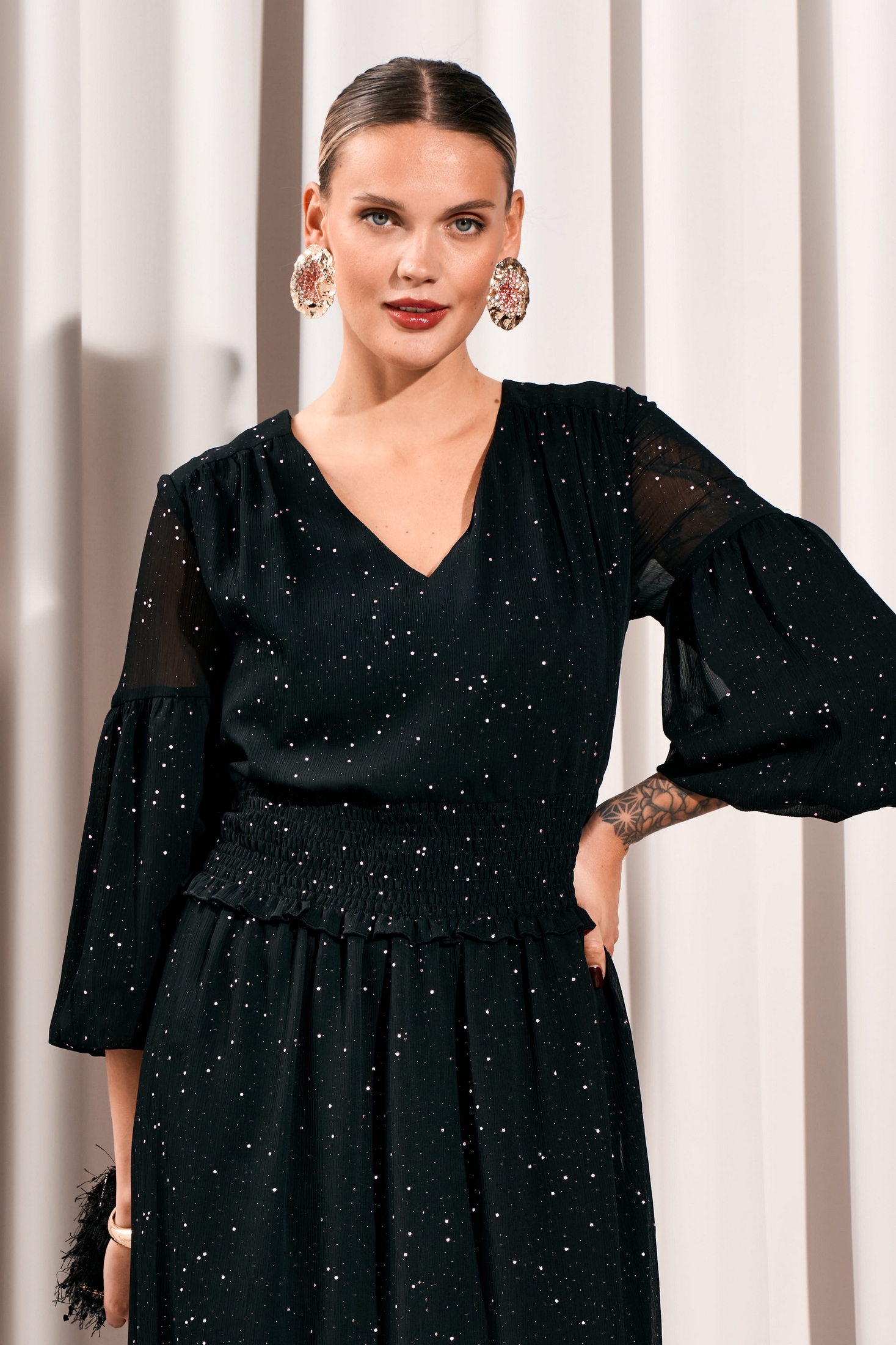 Платье с V- образным вырезом горловины и отрезной деталью собранной на венгерку по талии. Перед с кокеткой. Рукава втачные, состоящие из двух частей. Нижняя часть со сборкой и на подкладке. Платье на отлетной по низу подкладке.