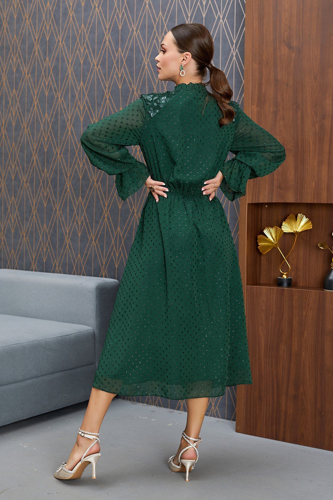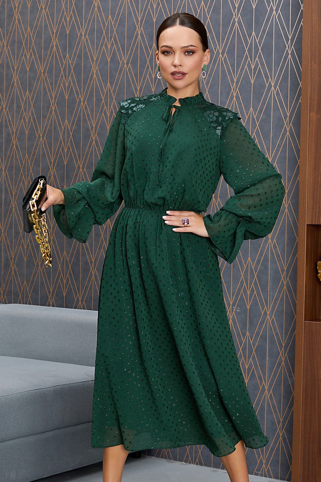 Ультрамодное платье с дизайнерскими рукавами выполнено из нежного шифона на легкой подкладке в сочетании с отделкой из вышитой кожи. Платье А - образного силуэта, по линии талии (на резинке) к низу расширено. Верхнее платье с резинкой по талии вкруговую, нижнее платье из подкладки цельное отлетное без резинки. Вырез горловины округлый со стойкой на сборке, по центу обработана глубокая капля с завязками. Перед и спинка с косыми кокетами из вышитой кожи с наложением на шифон. Рукав втачной, по низу с штроким воланом на резинке.