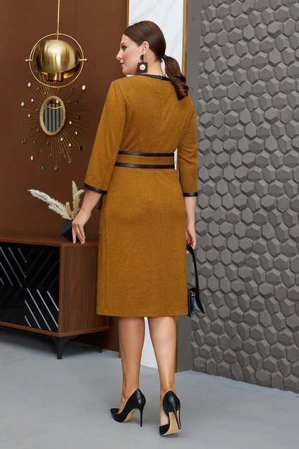 Платье с округлым вырезом горловины и съёмным поясом из ткани по талии. Перед с накладными карманами с клапанами в нижней части. Спинка с потайной молнией в среднем шве и талиевыми вытачками. По клапанам, горловине, низу рукавов и поясу идёт отделка из контрастной ткани.