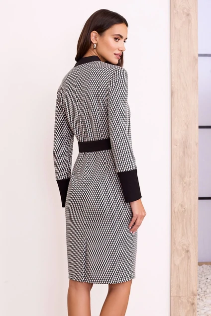 Платье с V – образным вырезом горловины, переходящим на стойку по спинке, и съёмным поясом из ткани по талии. Перед с фигурными деталями из контрастной ткани. Спинка со шлицей в среднем шве и талиевыми вытачками. Рукава втачные с трикотажным довязом по низу.