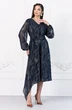 Элегантное платье средней длины, выполненное в темно-синем оттенке. Модель оформлена абстрактным графичным принтом в комбинации со светло-синим и бежевым, создающим утонченный визуальный эффект. Дизайн дополнен V-образным вырезом горловины, что придает образу изысканности. Изделие оснащено съемным поясом на талии, позволяющим акцентировать силуэт, а фигурный низ добавляет платью особого шарма. Рукава длинные, втачные, завершаются узкой резинкой для комфортной посадки. Спинка оформлена талиевыми вытачками, которые обеспечивают идеальную посадку. Платье дополнено подкладкой для дополнительного комфорта. Внимание: возможна замена фурнитуры на аналогичную такого же качества. Это изделие идеально подойдет для особых случаев и деловых встреч.