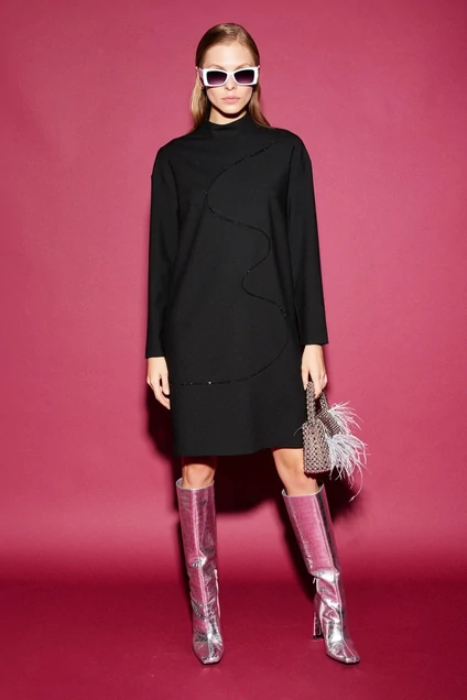 Стильное платье, выполненное из вискозной ткани. Платье прямого силуэта. Рукав длинный, линия плеча спущенная, воротник стойка. В среднем шве спинки расположена застежка на тесьму-молнию. По переду платья выполнена декоративная тесьма в виде «волны». Имеет длину до линии колена. Без подкладки.