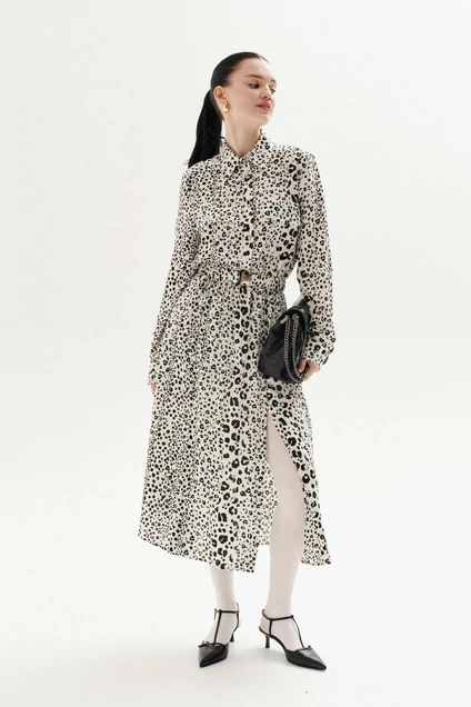 Платье свободного силуэта выполнено из плательной ткани с анималистическим принтом "леопард". Рукав втачной, по низу рукава манжеты на застёжку петлю и пуговицу. Воротник рубашечного кроя, застёжка до линии талии на петли и пуговицы, по лифу клапаны выше линии груди клапаны. Линия талии отрезная на резинке. По переду юбки два глубоких запаха, которые фиксируются навесными петли и пуговицами. По лифу спинки кокетка и отрезная линия талии. К платью прилагается съёмный пояс из основной ткани, на резинке, с металлической пряжкой.