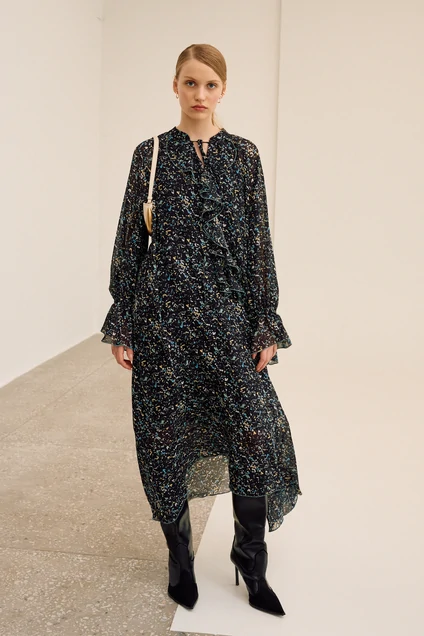 Платье свободного кроя, выполнено из шифона. Рукав длинный реглан, по низу рукава резинка. Глубокий V-образный вырез горловины, в который вставлена рюша, по горловине стойка на завязку, по середине выреза застежка на навесной потайной крючок. По линии талии по переду и спинке кулиса на завязку, по низу платья притачной волан. В комплект входит платье-комбинация из трикотажной подкладки на бретелях.