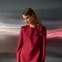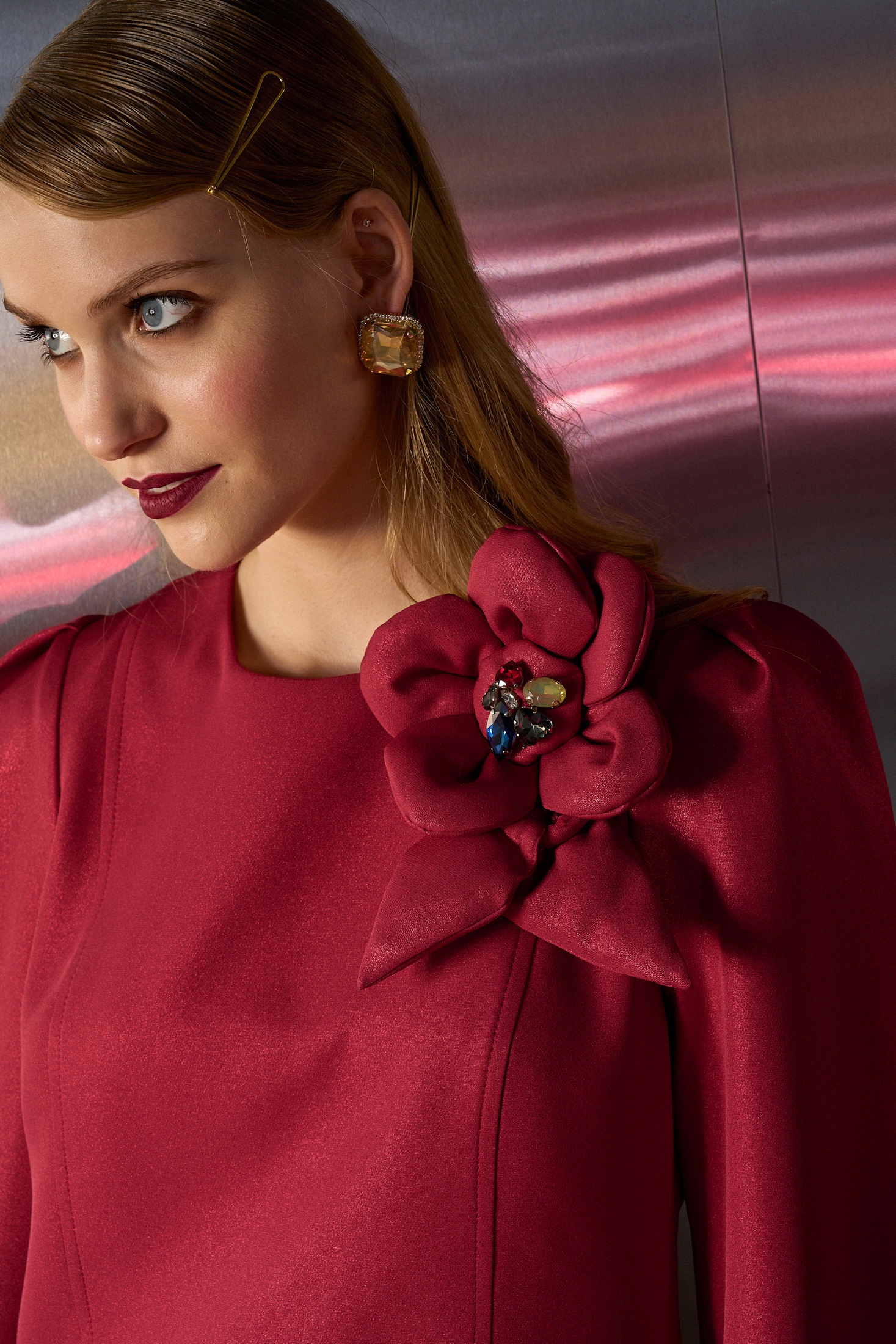 Платье свободного кроя, выполнено из плательной ткани, на подкладке. Рукав втачной, расширенный к низу, по верхней части рукава складки. Округлый вырез горловины, по переду и спинке вертикальные рельефы. По спинке средний шов, переходящий в застежку на потайную молнию. К платью предлагаем брошь-цветок.
