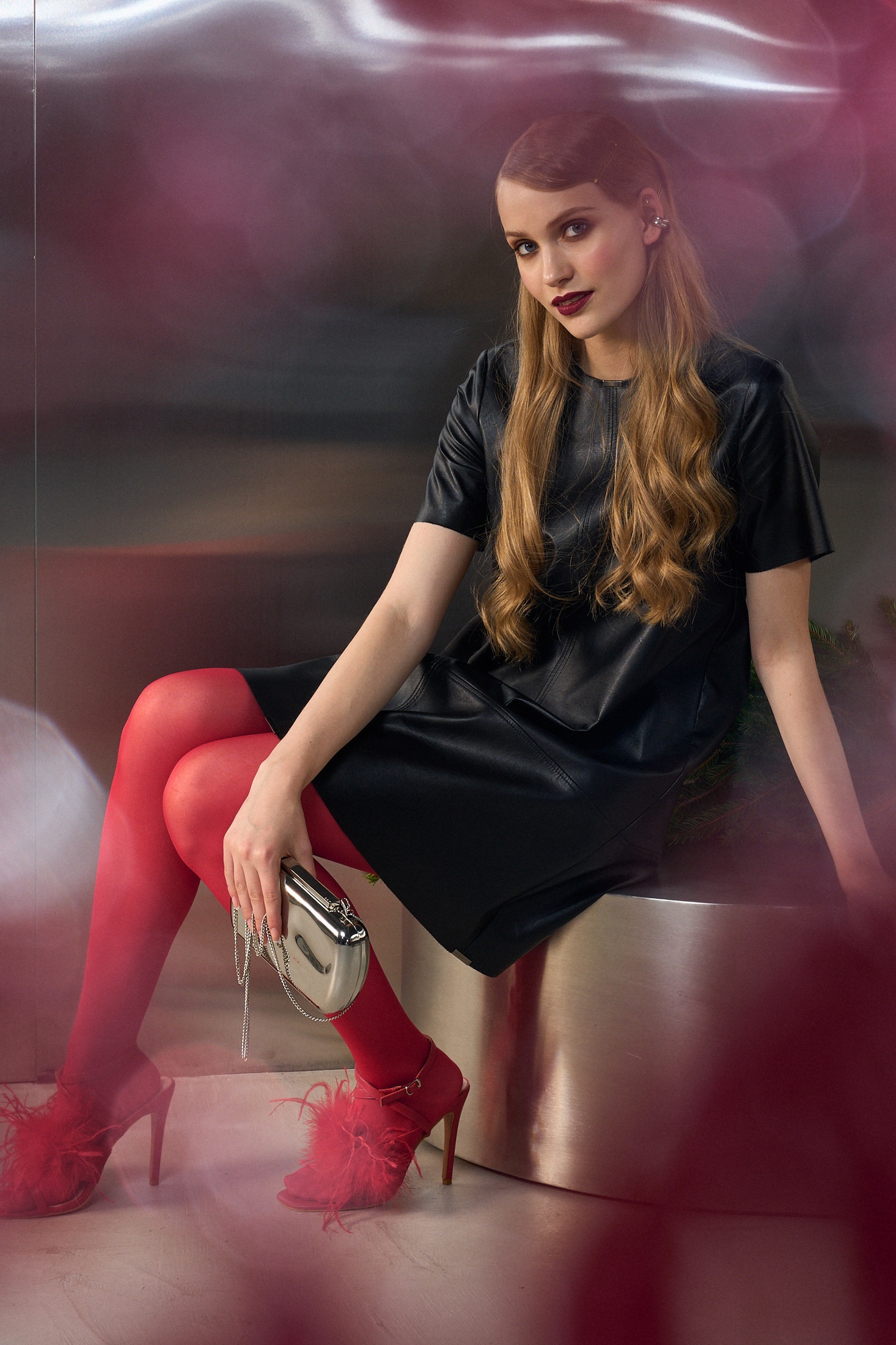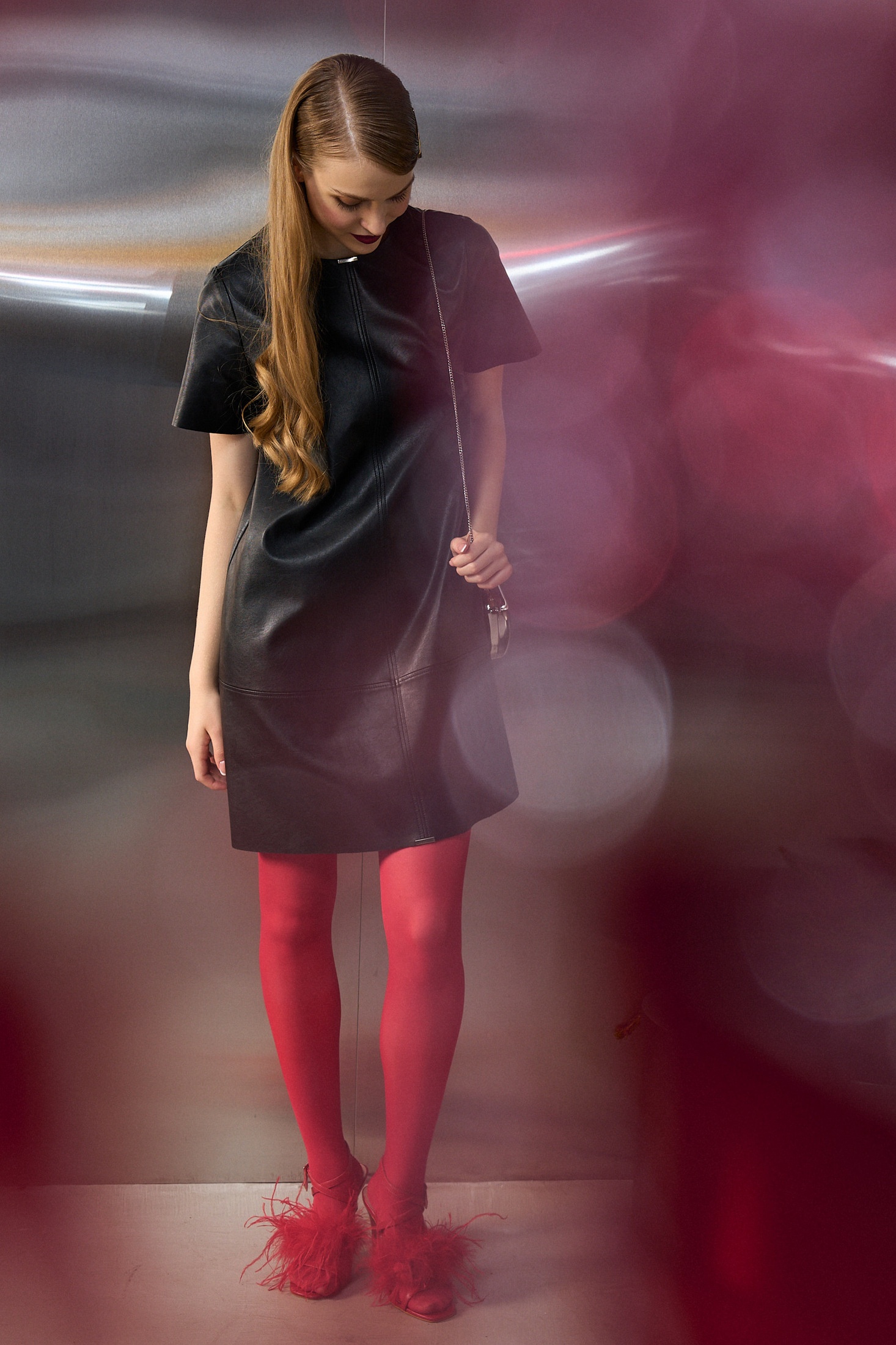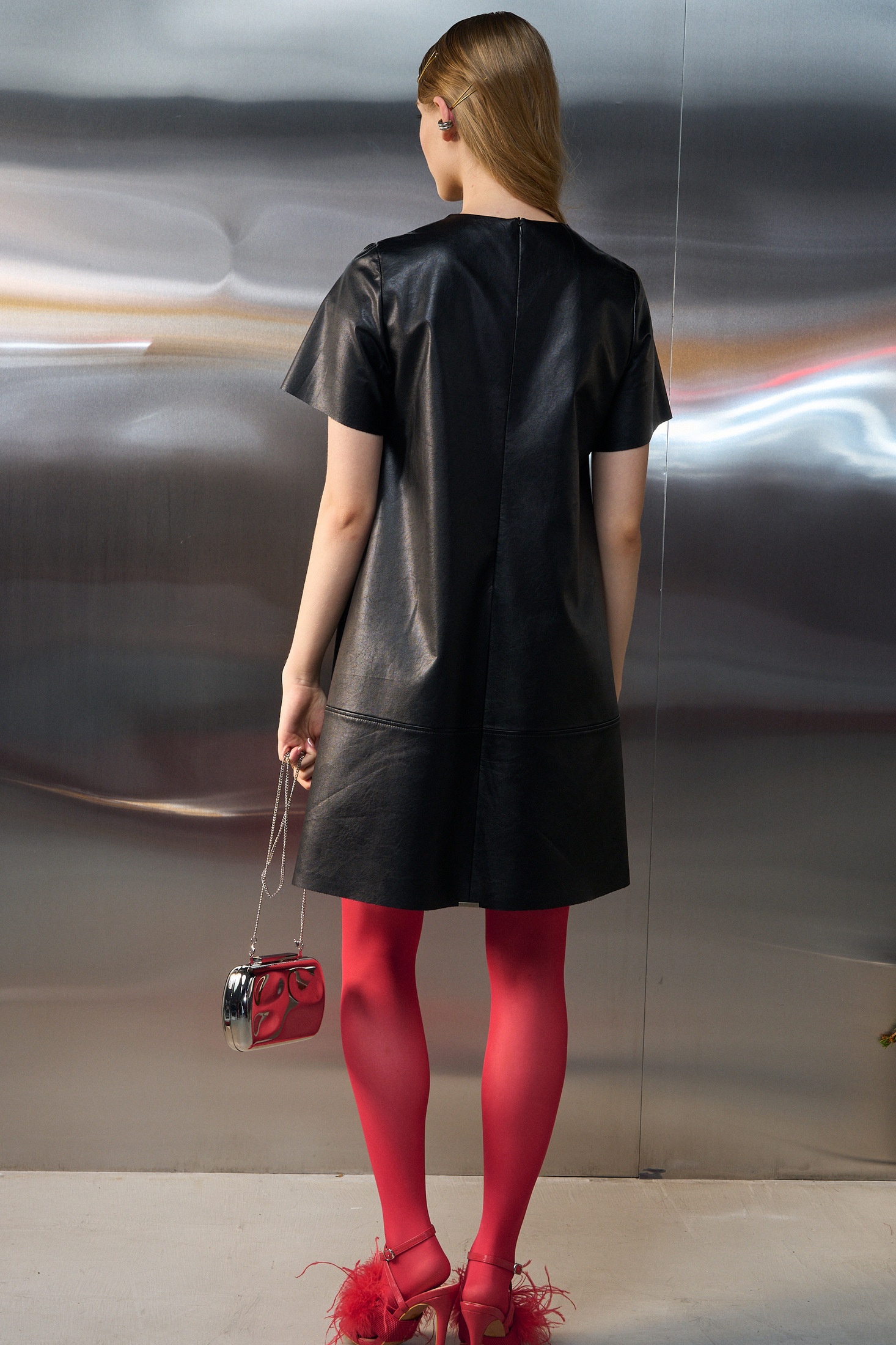 Платье А силуэта выполнено из экокожи, на подкладке. Рукав втачной короткий, округлый вырез горловины. По переду центральный шов и нагрудные вытачки. Застежка на потайную молнию в среднем шве спинки. Центральные, боковые швы и горловина декорированы металлическими зажимами.