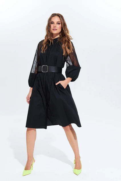 Рукава-фонарики и буфы – всё это супермодно в текущем сезоне. Всевозможные модели платьев с пышными и объемными рукавами разной длины можно увидеть в нашей нарядной коллекции. Одина из ярких моделей этого сезона – платье 697 свободного кроя А-силуэта. Рукав-реглан из кружева, низ рукава выполнен из основной ткани на эластичной-тесьме, благодаря которой и создаётся объём рукава, по горловине воротник-стойка. По переду притачная потайная планка с застёжкой на петли и пуговицы. По переду и спинке сборка, выходящая от шва притачивания стойки воротника. В боковых швах прорезные карманы. В платье в шов проймы рукава и в стойку вшита тесьма из нежной сетки, инкрустированной внутри камнями в оправе. В комплектацию платья входит пояс из эко-кожи с металлической пряжкой. Не стоит скромничать в наше сложное время – пусть ваш образ в этом платье будут ярким и броским. В платье есть всё: стиль, элегантность, универсальность и классика. Осталось только подобрать обувь и сумочку - и вы прекрасны! Приобретайте и носите с удовольствием!