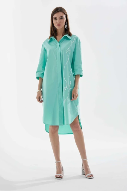 Стильное платье прямого силуэта из хлопковой ткани с закругленным к боковым швам низом. Воротник рубашечного типа, по переду супатная (потайная) застежка. Рукав со спущенной линией плеча, по низу манжета. На спинке кокетка со складками. На боковых швах расположены декоративные элементы с пуговицами. На левой полочке платья расположен дизайнерский принт. Рост 164-170 длина изделия: 106 см длина рукава: 55см