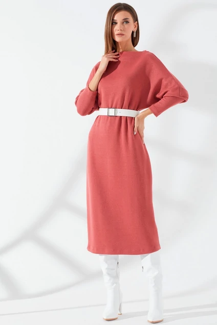 Комфортное платье из трикотажного полотна прямого силуэта. Горловина лодочка с цельнокроеной обтачкой. Спинка со средним швом и разрезом по низу. Рукав втачной длинный, со спущенной линией плеча. В комплект входит съемный ремень. Длина платья: 120 см