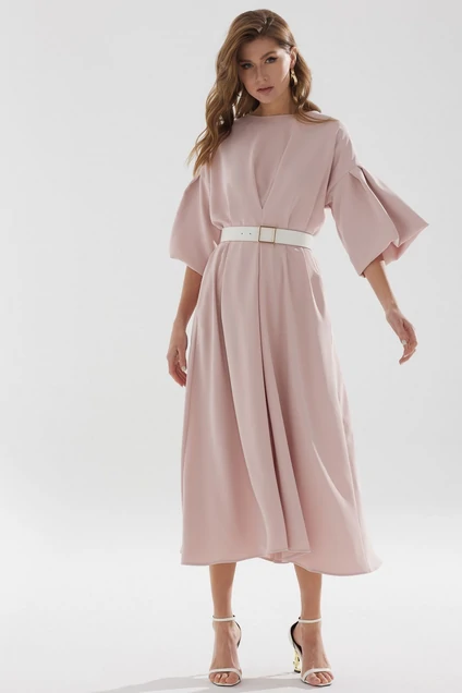 Нарядное платье А-образного силуэта из струящейся ткани. Горловина округлая, на спинке застежка на петлю и пуговицу. По переду и спинке декоративная складка. Рукав со спущенной линией плеча, расклешенный книзу. В боковых швах функциональные карманы. В комплект входит ремень. Длина изделия: 128 см