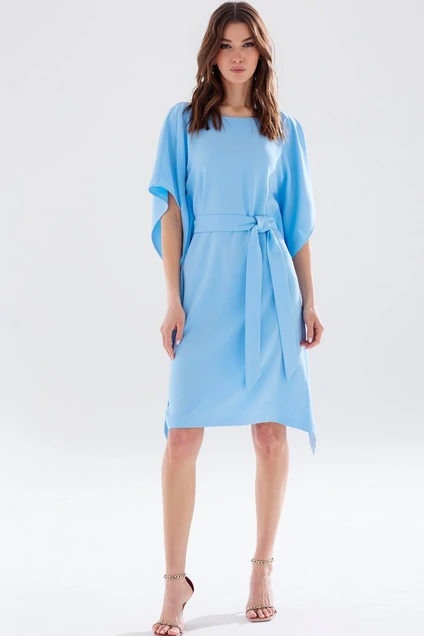 Нарядное платье с цельнокроеным рукавом прямого силуэта из струящейся ткани. Горловина-лодочка. По боковым швам в области талии обработаны отверстия для пояса с целью регулирования степени облегания. Длина изделия: (44-48р - 96см), (50-54р - 102см), (56-60р - 106см)
