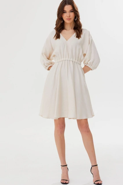 Стильное платье полуприлегающего силуэта расширенное книзу из струящейся ткани. По переду и спинке V-образный вырез горловины. Рукав цельнокроеный по низу на резинке. Платье отрезное по линии талии на резинке. В боковых швах карманы. На спинке завязки. Длина изделия: (42-46р - 93см) (48-52р - 98см)