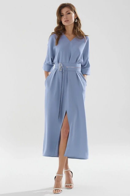Стильное платье прямого силуэта из струящейся ткани. Горловина с V-образным вырезом. По переду средний шов, переходящий по низу в разрез. Рукав цельнокроеный по низу манжета. В комплект прилагается оригинальный съемный пояс. В боковых швах карманы. Длина изделия: 131 см