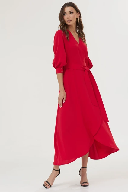 Нарядное платье полуприлегающего силуэта, расширенное к низу из струящейся ткани. Горловина с V-образным вырезом на запах. Рукав втачной длиной 3/4 с декоративным разрезом. Низ рукава с притачной манжетой со сборкой и застежкой на петли и пуговицы. Платье отрезное по линии талии. Лиф переда с нагрудными вытачками. Лиф спинки с талиевыми вытачками. Обращаем ваше внимание, что фурнитура может незначительно отличаться от фото.
