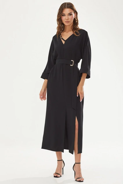 Стильное платье прямого силуэта из струящейся ткани. Горловина V-образная с декоративной деталью. По переду два рельефа, переходящие в шлицы. Рукав цельнокроеный, по низу манжета. В боковых швах карманы. В комплект входит съемный пояс. Обращаем ваше внимание, что фурнитура может незначительно отличаться от фото. Длина изделия: 128см