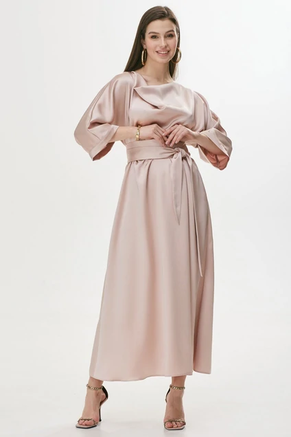 Нарядное платье полуприлегающего силуэта расширенное книзу из струящейся ткани. Горловина ‘’качель’’. Рукав цельнокроенный, по низу манжета. Платье отрезное по линии талии, в подрез вставлена эластичная тесьма (резинка). В комплект входит съемный пояс. Обращаем ваше внимание, что фурнитура может незначительно отличаться от фото.Длина платья: 132 см Длина рукава от горловины: 47 см