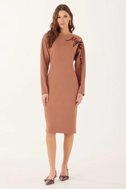 Платье полуприлегающего силуэта из трикотажного полотна. Горловина округлая. На спинке в центральном шве потайная молния, по низу – разрез. Цельнокроеный рукав. По переду дизайнерская вышивка. Длина изделия 105см